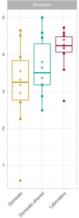 서식하는 미생물의 다양성은 가정용 전자레인지가 가장 낮았다. 생물 다양성을 평가하는 섀넌 지수에서 가정용 주방 전자레인지(노란색)는 '4'를 밑돌았지만, 실험실 전자레인지(빨간색)는 '4'를 웃도는 점수를 보였다. 공용 전자레인지(녹색)는 그 중간에 위치하고 있다.