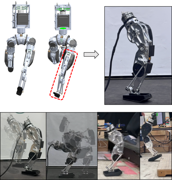 연구팀은 이번 과정에서 단일 다리 기반 ‘홉핑(Hopping)’ 로봇도 제작했다. 이 로봇은 한 발로 균형을 유지하며 반복적으로 뛰는 고난도 동작과 360도 공중제비 같은 극한 운동 능력까지 구현했다. 특히 생물학적 참고 모델이 없는 상황에서 질량중심 속도를 최적화하고 착지 충격을 줄이는 AI 제어기를 강화학습으로 구현해 의미 있는 성과를 거뒀다.
