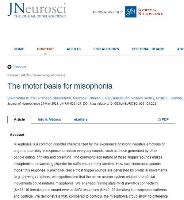 최근 진행한 연구 결과를 바탕으로 영국 뉴캐슬 대학 연구팀이 "미소포니아를 앓는 사람은 안면 운동을 관장하는 뇌 영역이 일반인보다 강하게 반응한다"고 밝혔다. 논문은 국제학술지 '신경과학저널'(Journal of Neuroscience)에 게재됐다.